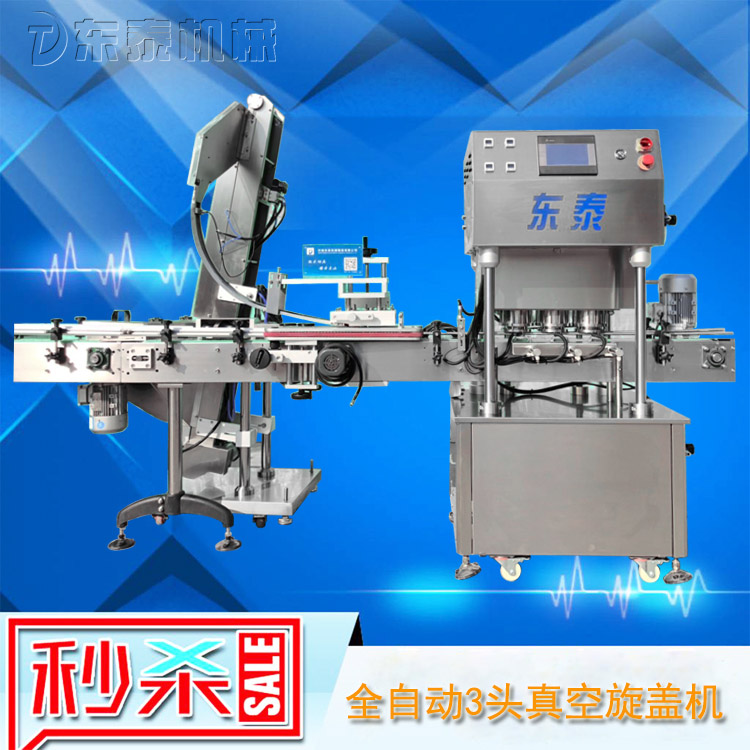 該直線式真空旋蓋機(jī)是東泰機(jī)械結(jié)合用戶使用的情況,摒棄了傳統(tǒng)轉(zhuǎn)盤式真空旋蓋機(jī)的弊端,研制開發(fā)的新型高效設(shè)備,設(shè)備自動(dòng)檢測(cè)到兩個(gè)瓶子蓋子進(jìn)入到雙頭真空旋蓋機(jī)內(nèi),旋蓋機(jī)彩色顯示屏?xí)?shí)時(shí)顯現(xiàn)旋蓋狀況,整機(jī)多點(diǎn)檢測(cè),當(dāng)進(jìn)口無瓶無蓋、出口堵塞、定位不準(zhǔn)、瓶身傾倒均自動(dòng)停機(jī)。單個(gè)旋蓋頭達(dá)到的真空度都可以單顯示,單調(diào)整