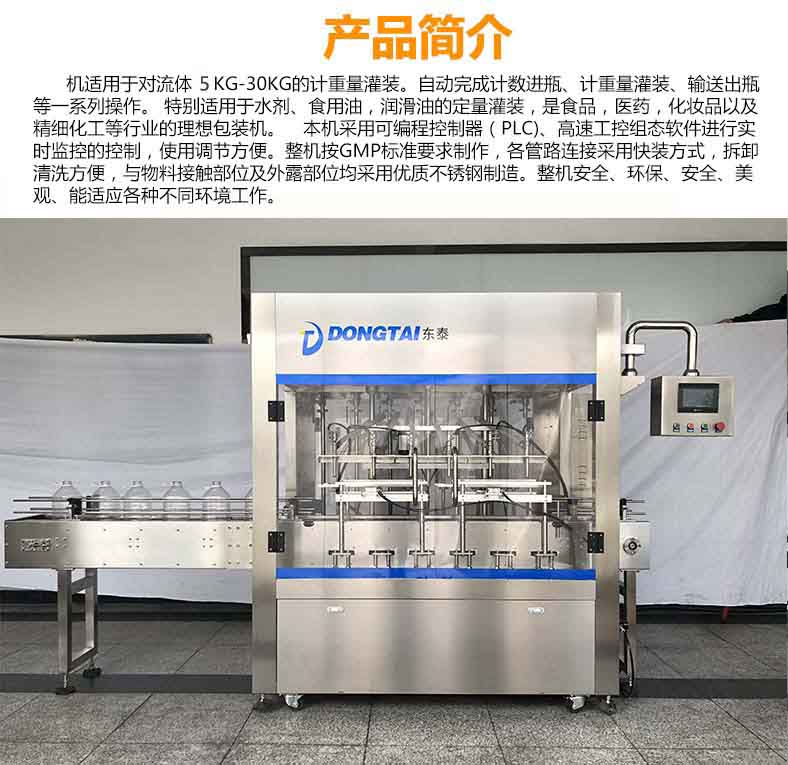 本機適用于對流體5kg-30kg的計重量灌裝。自動完成計數(shù)進瓶、計重量灌裝、輸送出瓶等一系列操作。 特別適用于水劑、食用油,潤滑油的定量灌裝,是食品,醫(yī)藥,化妝品以及精細化工等行業(yè)的包裝機。本機采用可編程控制器(PLC)、高速工控組態(tài)軟件進行實時監(jiān)控的控制,使用調(diào)節(jié)方便。整機按GMP標準要求制作,各管路連接采用快裝方式,拆卸清洗方便,與物料接觸部位及外露部位均采用優(yōu)質(zhì)不銹鋼制造。整機安全、環(huán)保、安全、美觀、能適應(yīng)各種不同環(huán)境工作。