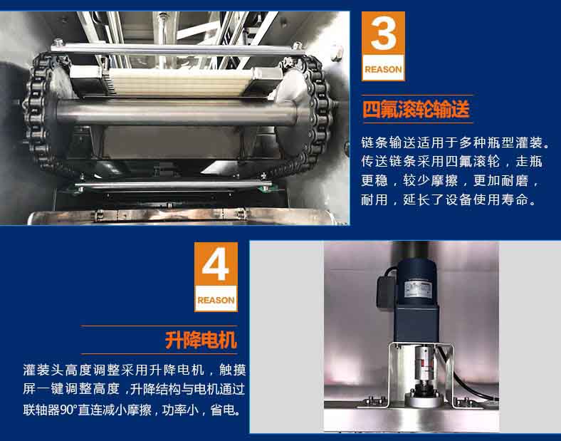 2、鏈條輸送適用于多種瓶型灌裝。傳送鏈條采用四氟滾輪,走瓶更穩(wěn),較少摩擦,更加耐磨,耐用,延長了設(shè)備使用壽命。增加卡瓶口裝置:方便瓶口小的容器灌裝,灌裝頭和瓶口的定位更準確;采用O型擋板,屏蔽漲緊輪的弊端(采用魚眼調(diào)節(jié)鏈輪的松緊度),輸送采用四氟滾輪式,容器輸送更平穩(wěn),可正反轉(zhuǎn)輸送;