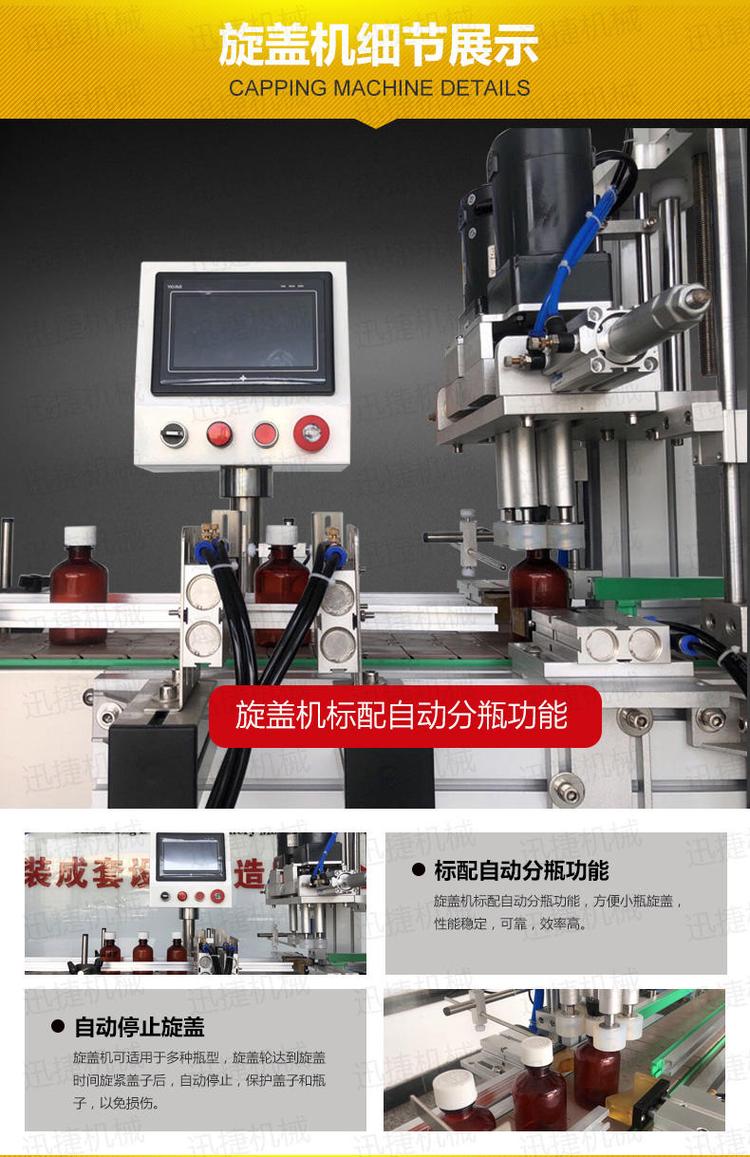 旋蓋優(yōu)勢有:旋蓋機(jī)擁有做到自動(dòng)分瓶功能,當(dāng)瓶蓋旋緊時(shí)可自動(dòng)停止旋蓋,保護(hù)了蓋子和瓶子免受損傷。塑料瓶消毒水灌裝機(jī)(小玻璃瓶溶液灌裝機(jī))整機(jī)由304不銹鋼材質(zhì)組成,灌裝效率和精度高,雙重保證您的物料的包裝效果。