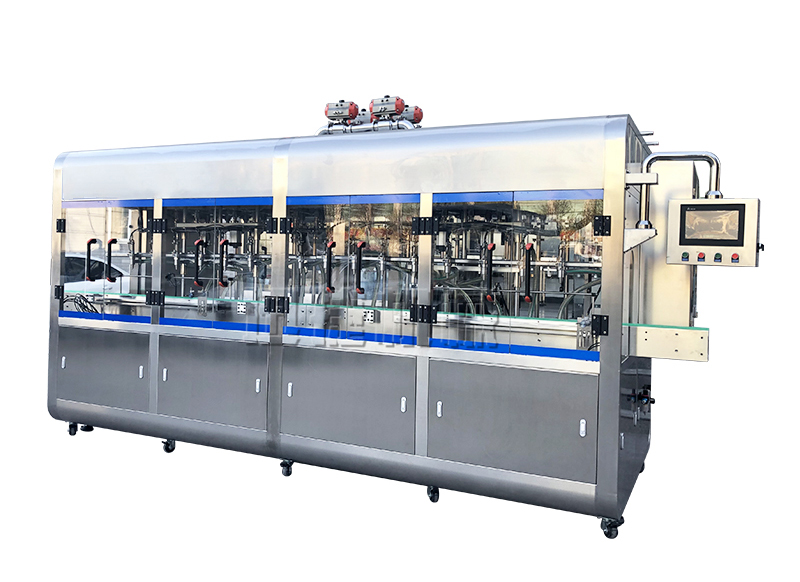灌裝機(jī)儲(chǔ)油箱部分與灌裝機(jī)連接法蘭保持原位置,避免沖洗,避免雜質(zhì)進(jìn)入;儲(chǔ)油箱容積≥600KG,內(nèi)部設(shè)有阻擋板,避免油品輸入過(guò)程油品外冒,同時(shí)保證灌裝精度;儲(chǔ)油箱位置設(shè)在灌裝機(jī)頂部,自帶可視液位計(jì),頂部箱蓋大包圍設(shè)計(jì)并且可以打開(kāi),具備排氣功能(排出氣泡等);灌裝頭整體上升方式平穩(wěn),不產(chǎn)生震動(dòng),高度及寬度可調(diào)。