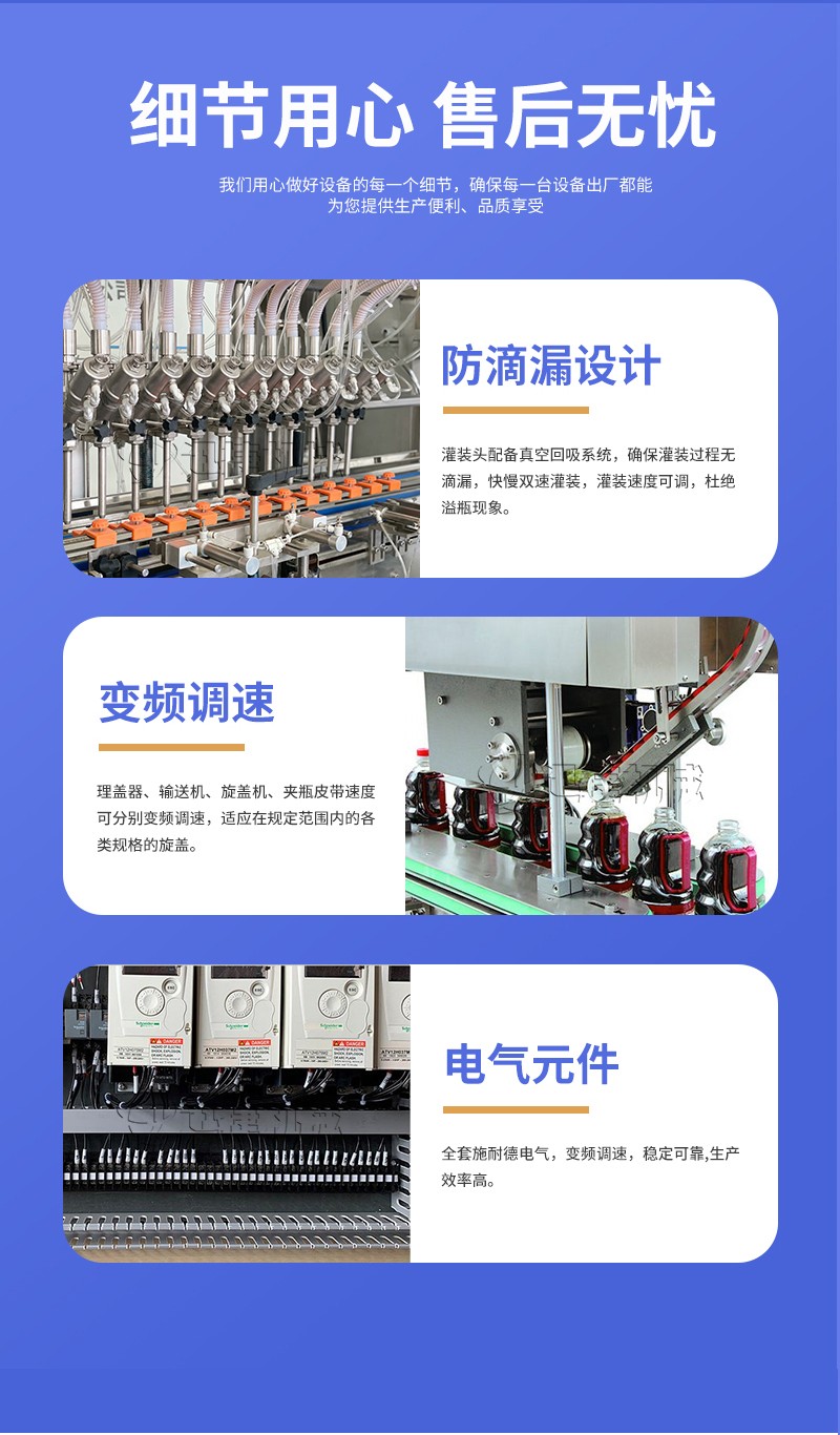 4、定量灌裝,一鍵調(diào)節(jié)??焖俳涌谝撞鹨紫?,無滴漏下潛灌裝。