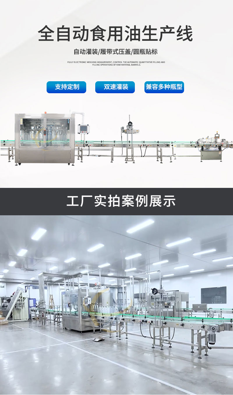 全自動食用油灌裝生產(chǎn)線根據(jù)用戶需求非標定制,灌裝部分為八頭灌裝機,適用于不同瓶子的灌裝,配備壓蓋機和貼標機,自動化程度高。