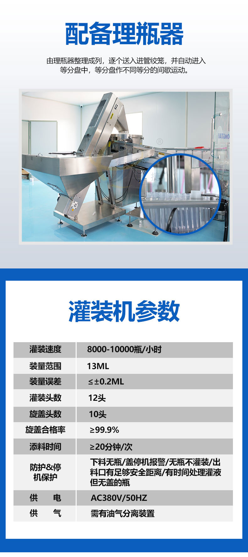 全自動診斷試劑灌裝旋蓋生產線由理瓶器整理成列,逐個送入進管絞龍,并自動進入等分盤中,等分盤作不同等分的間歇運動。